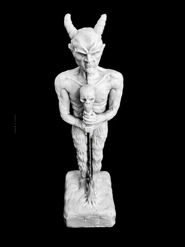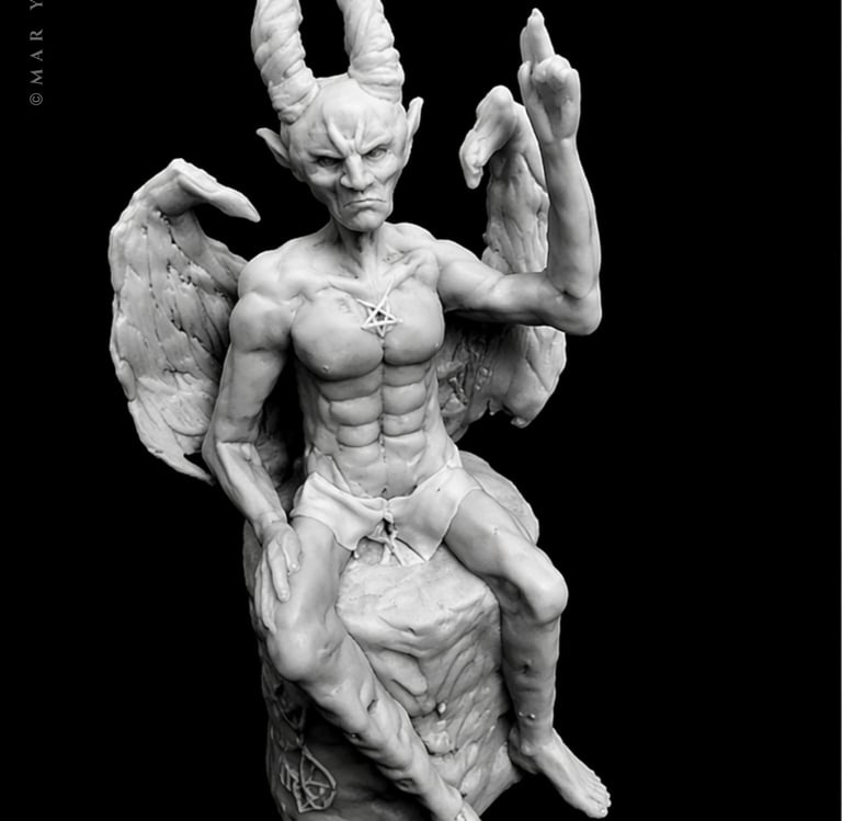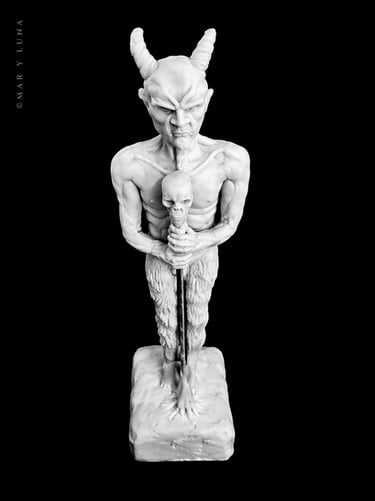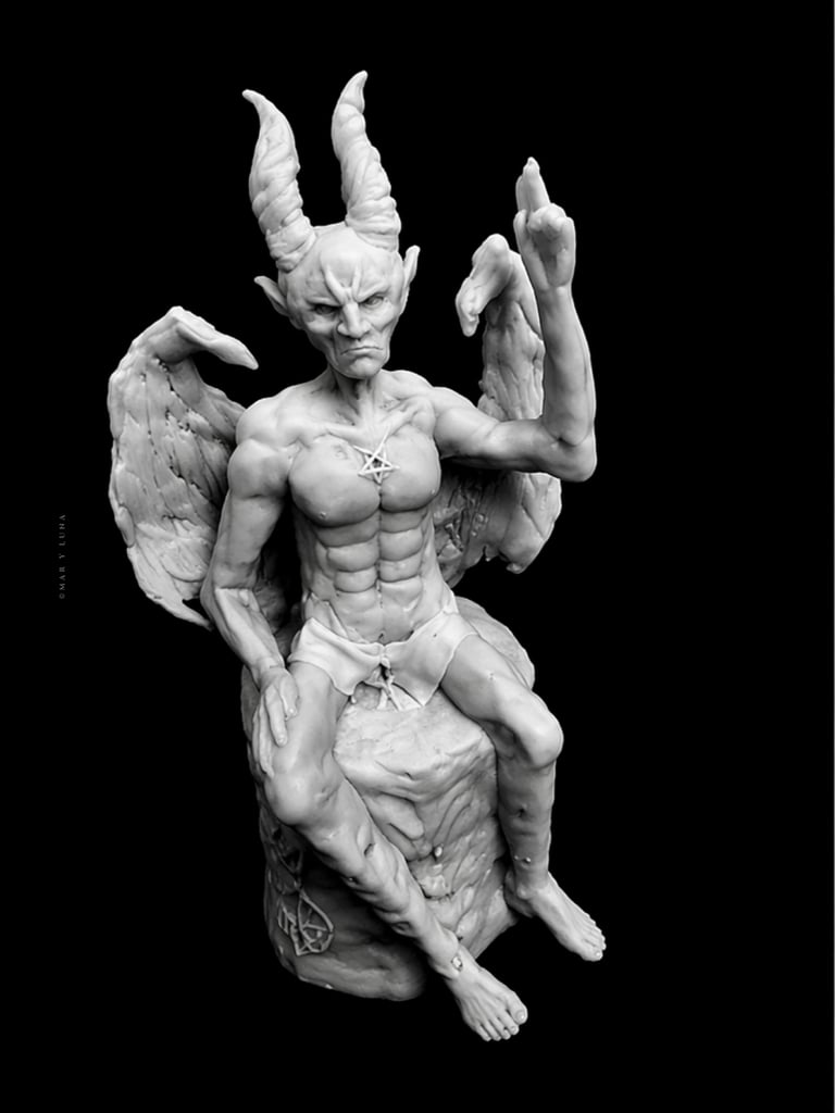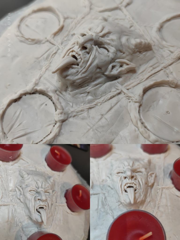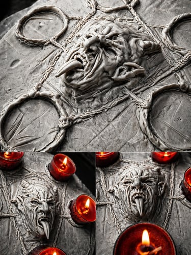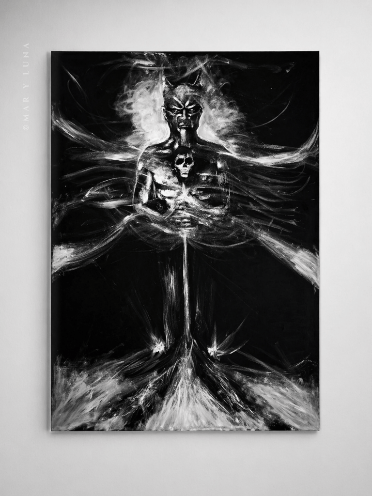 Dark art expressed through sculpture and painting.